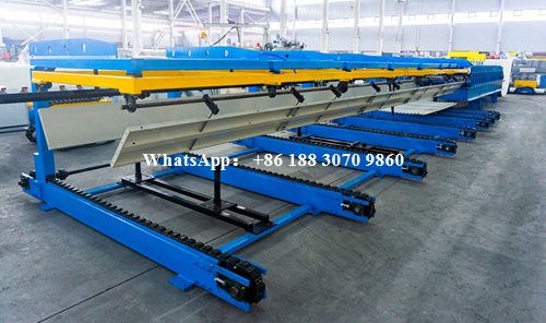 After forming and cutting, finished corrugated iron sheets are transferred to an automatic stacking machine. The stacker arranges sheets neatly and consistently, reducing manual handling and improving workplace safety.